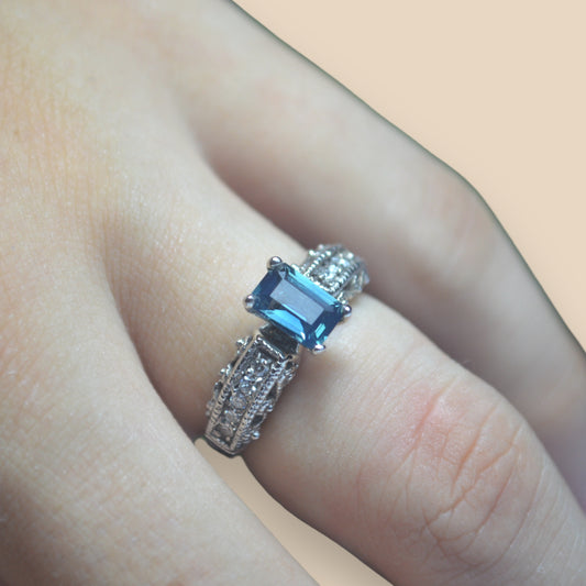 Anillo de zafiro azul con 10 diamantes en oro blanco de 18 kilates