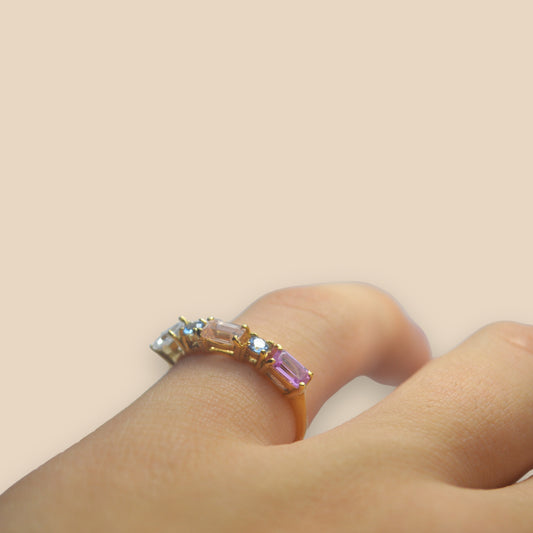 Anillo de zafiros arcoíris y aguamarinas en oro de 18 kilates